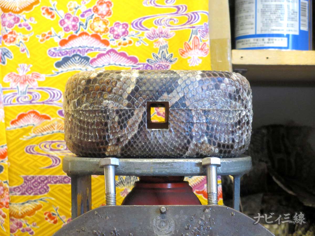 表面を叩きながら皮張り器を少しずつ緩め、音を確かめながら張りの強さを調整します。
