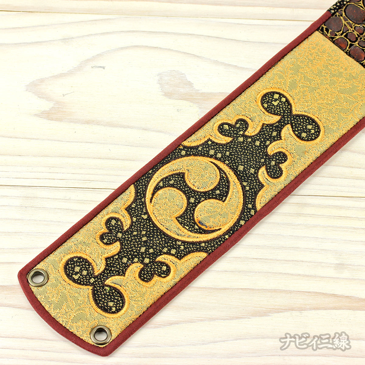 2種類の金襴生地をベースに金色糸で御紋が刺繍されたティーガーです。